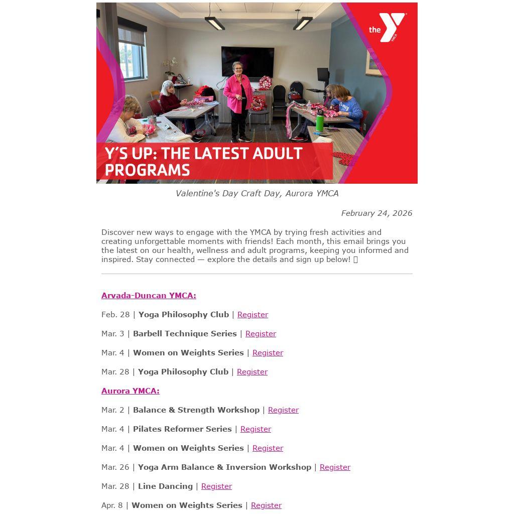 Discover new ways to engage with the YMCA by trying fresh activities and creating unforgettable moments with friends! Each month, this email brings you the latest on our health, wellness and adult programs, keeping you informed and inspired. Stay connected — explore the details and sign up below! 👇
