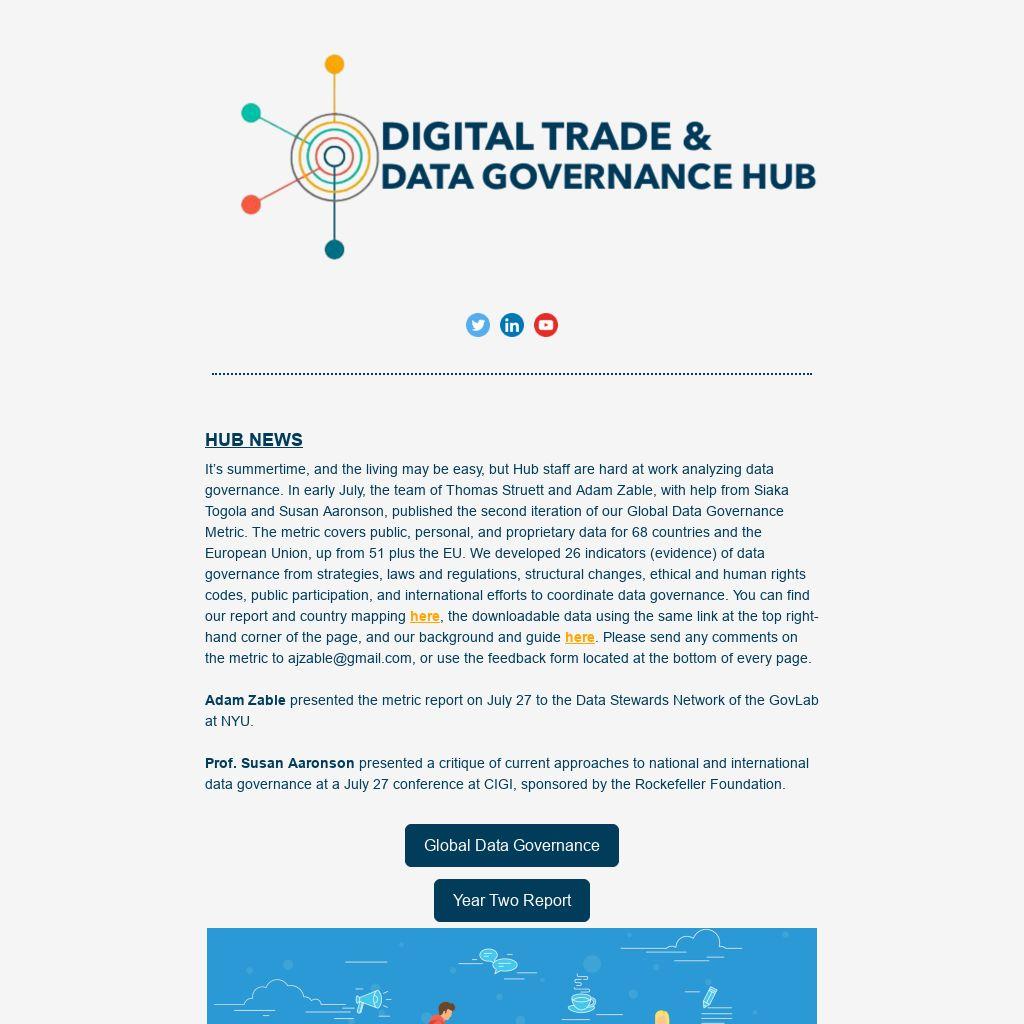 It’s summertime, and the living may be easy, but Hub staff are hard at work analyzing data governance. In early July, the team of Thomas Struett and Adam Zable, with help from Siaka Togola and Susan Aaronson, published the second iteration of our Global Data Governance Metric. The metric covers public, personal, and proprietary data for 68 countries and the European Union, up from 51 plus the EU. We developed 26 indicators (evidence) of data governance from strategies, laws and regulations, structural changes, ethical and human rights codes, public participation, and international efforts to coordinate data governance. You can find our report and country mapping here, the downloadable data using the same link at the top right-hand corner of the page, and our background and guide here. Please send any comments on the metric to ajzable@gmail.com, or use the feedback form located at the bottom of every page.