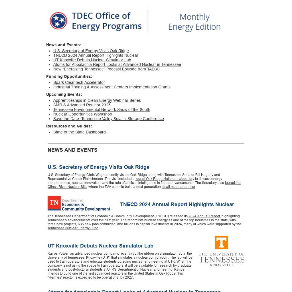 The Tennessee Department of Economic & Community Development (TNECD) released its 2024 Annual Report, highlighting Tennessee's advancements over the past year. The report lists nuclear energy as one of the top industries in the state, with three new projects, 635 new jobs committed, and billions in capital investments in 2024, many of which were supported by the Tennessee Nuclear Energy Fund.