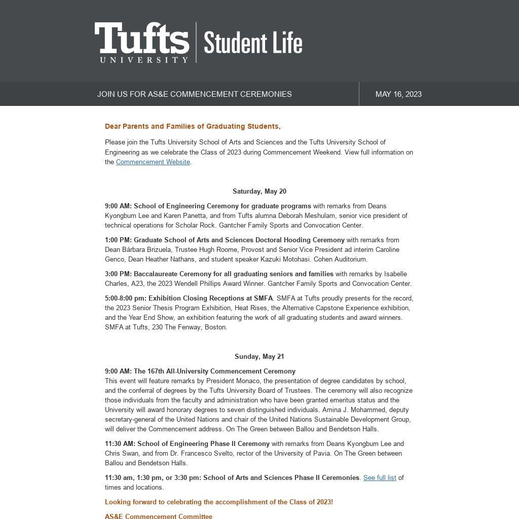 Please join the Tufts University School of Arts and Sciences and the Tufts University School of Engineering as we celebrate the Class of 2023 during Commencement Weekend. View full information on the Commencement Website.