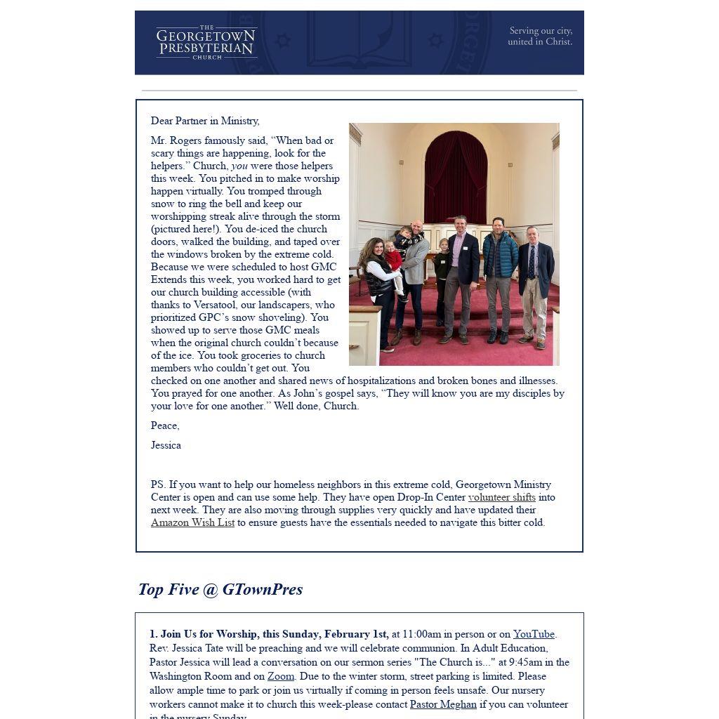Mr. Rogers famously said, “When bad or scary things are happening, look for the helpers.” Church, you were those helpers this week. You pitched in to make worship happen virtually. You tromped through snow to ring the bell and keep our worshipping streak alive through the storm (pictured here!). You de-iced the church doors, walked the building, and taped over the windows broken by the extreme cold. Because we were scheduled to host GMC Extends this week, you worked hard to get our church building accessible (with thanks to Versatool, our landscapers, who prioritized GPC’s snow shoveling). You showed up to serve those GMC meals when the original church couldn’t because of the ice. You took groceries to church members who couldn’t get out. You checked on one another and shared news of hospitalizations and broken bones and illnesses. You prayed for one another. As John’s gospel says, “They will know you are my disciples by your love for one another.” Well done, Church.