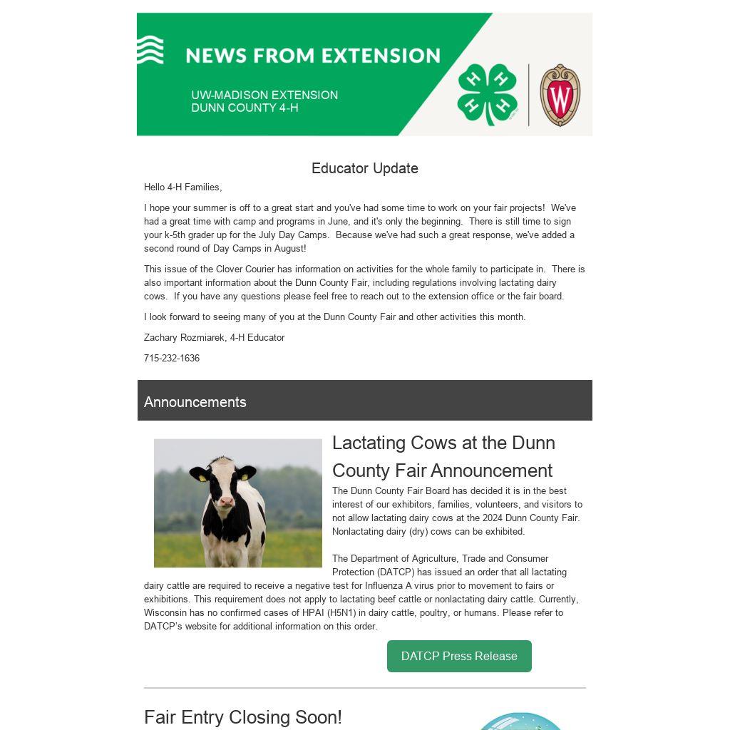 This issue of the Clover Courier has information on activities for the whole family to participate in. There is also important information about the Dunn County Fair, including regulations involving lactating dairy cows. If you have any questions please feel free to reach out to the extension office or the fair board.