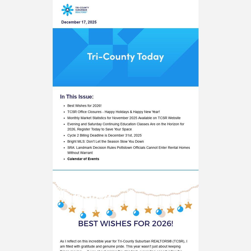 Tri-County Suburban REALTORS® will be closed beginning at 12pm on Wednesday, December 24, 2025, and remain closed through Friday, December 26, 2025. Business hours will resume at 8am on Monday, December 29, 2025.