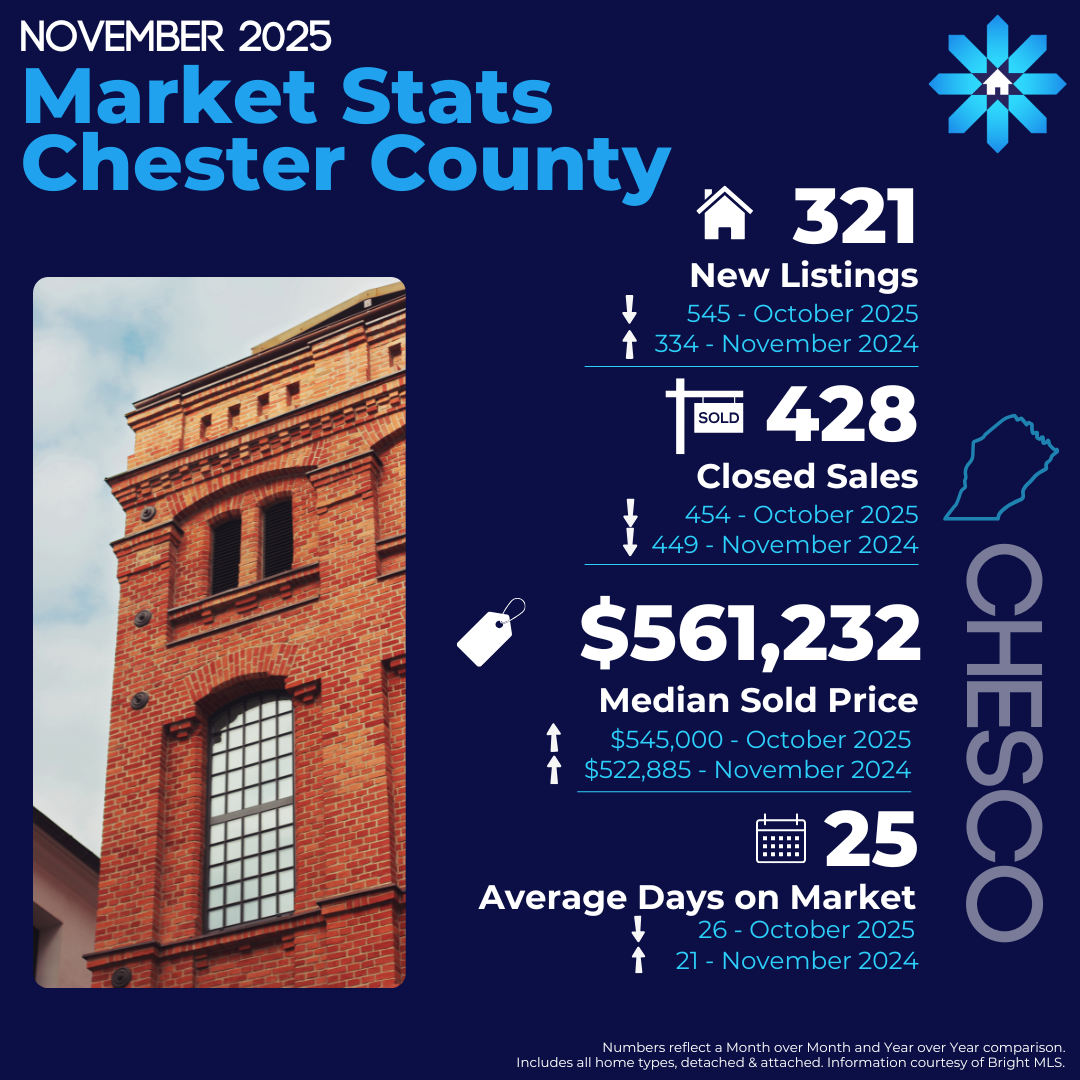 An assortment of reports is also available to Bright MLS subscribers at BrightMLS.com such as a monthly Market Report, and a Marketing ToolKit to coincide. The Philadelphia Metro November 2025 Housing Market Report will also offer monthly market data in that region with infographics, charts, and more. Tri-County's major counties (Chester, Delaware, and Montgomery) are included in this report. For more detailed report, once logged into Bright MLS, click the "Market" tab and choose the "Market Statistics Report" button in the drop-down menu to access various reports.