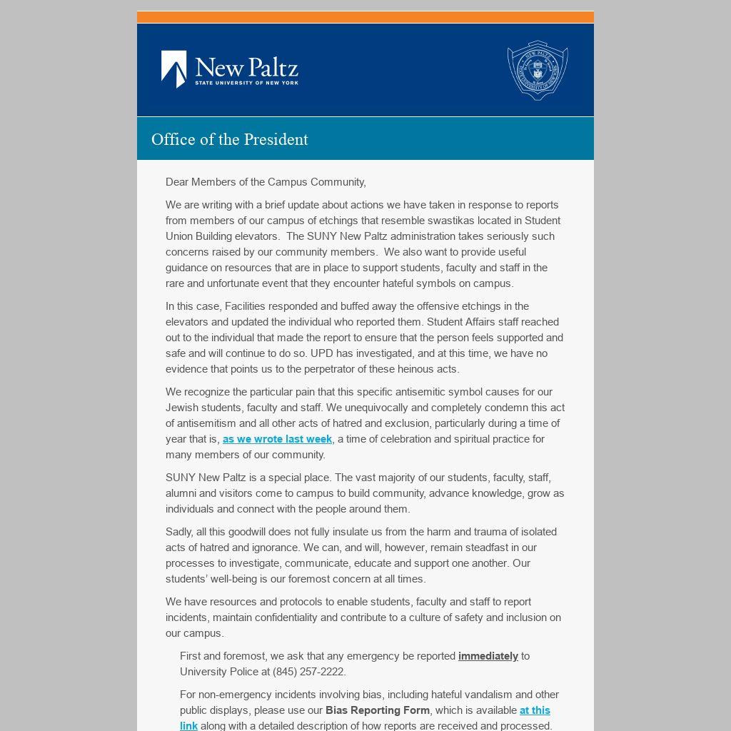 We are writing with a brief update about actions we have taken in response to reports from members of our campus of etchings that resemble swastikas located in Student Union Building elevators. The SUNY New Paltz administration takes seriously such concerns raised by our community members. We also want to provide useful guidance on resources that are in place to support students, faculty and staff in the rare and unfortunate event that they encounter hateful symbols on campus.