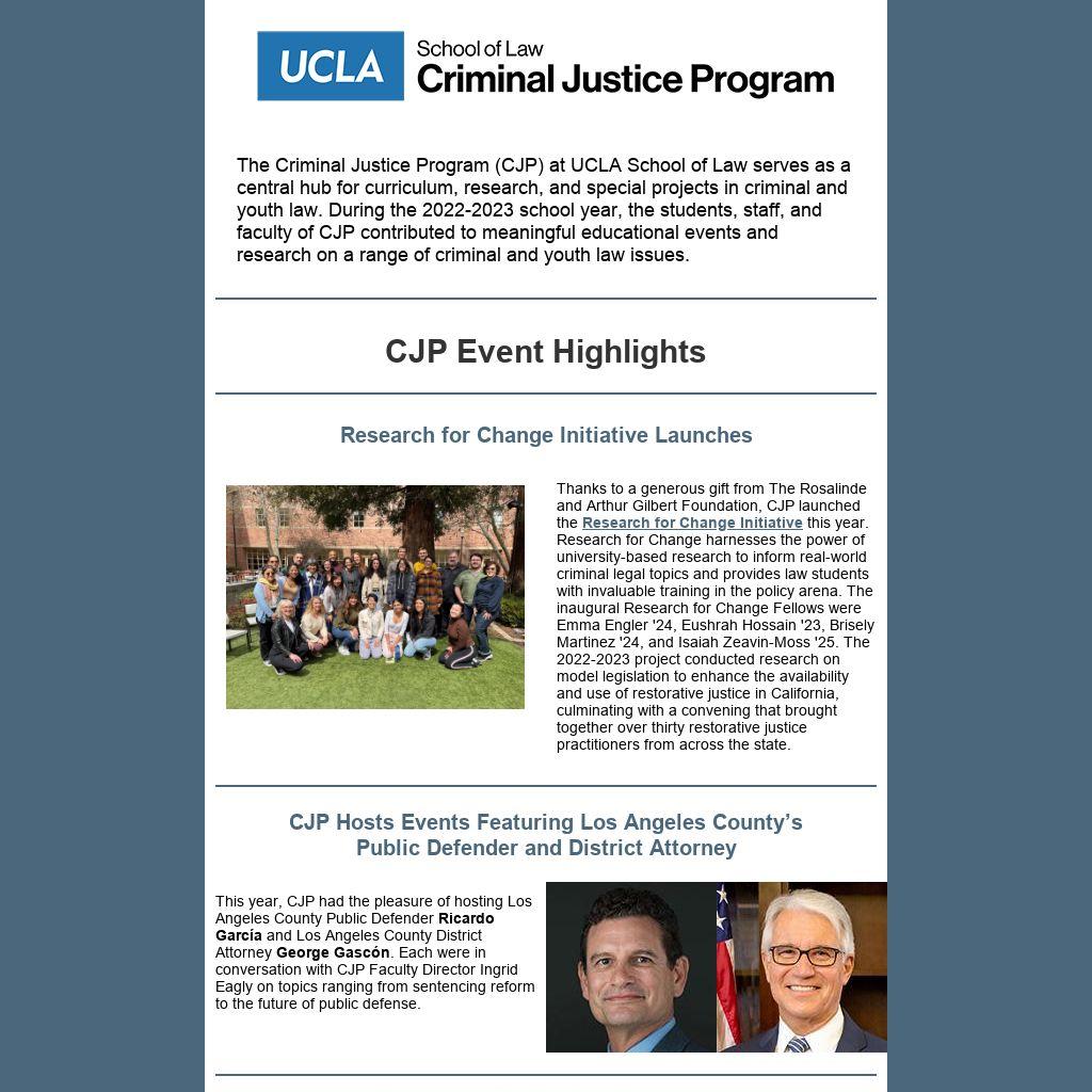 The Criminal Justice Program (CJP) at UCLA School of Law serves as a central hub for curriculum, research, and special projects in criminal and youth law. During the 2022-2023 school year, the students, staff, and faculty of CJP contributed to meaningful educational events and research on a range of criminal and youth law issues.
