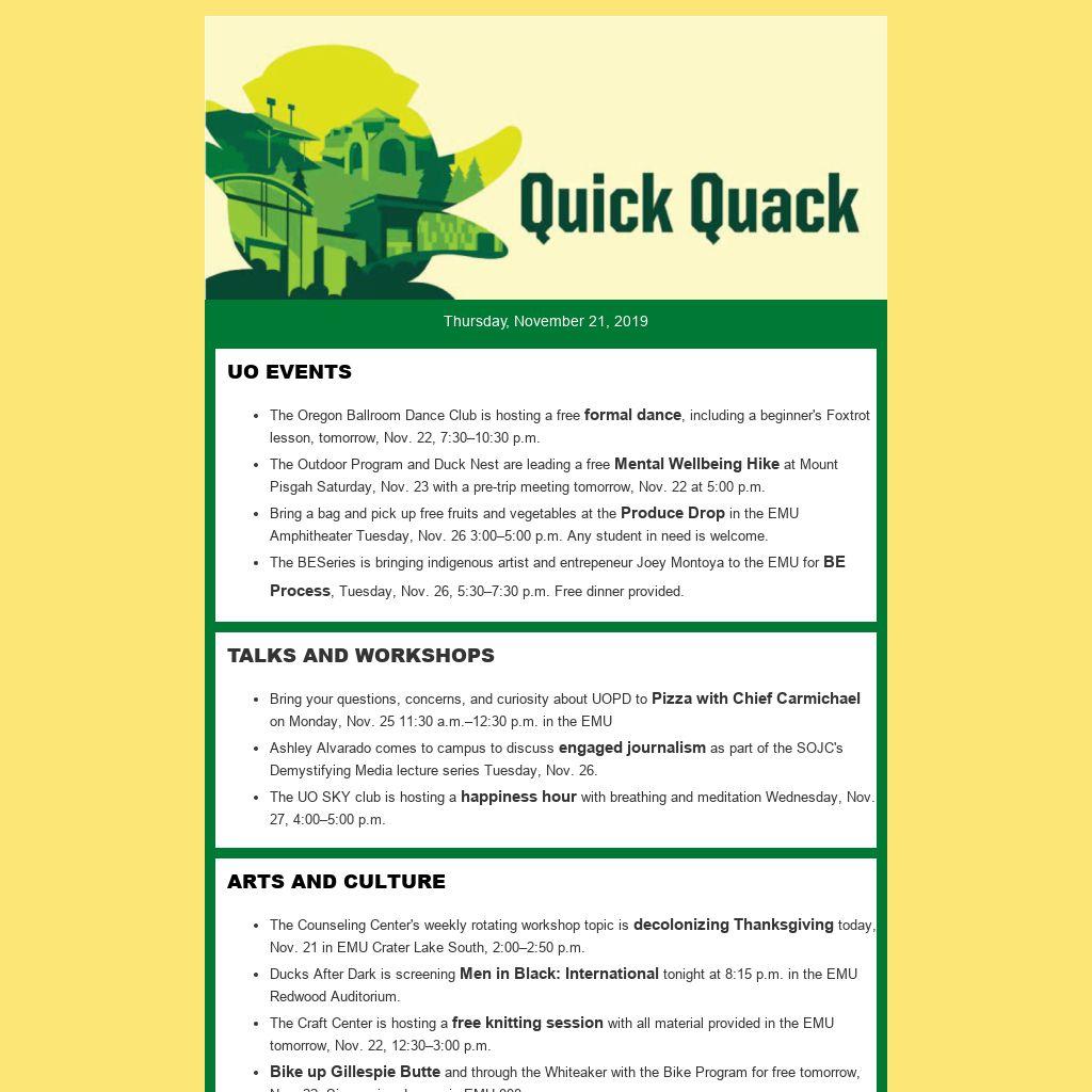 Bring your questions, concerns, and curiosity about UOPD to Pizza with Chief Carmichael on Monday, Nov. 25 11:30 a.m.–12:30 p.m. in the EMU