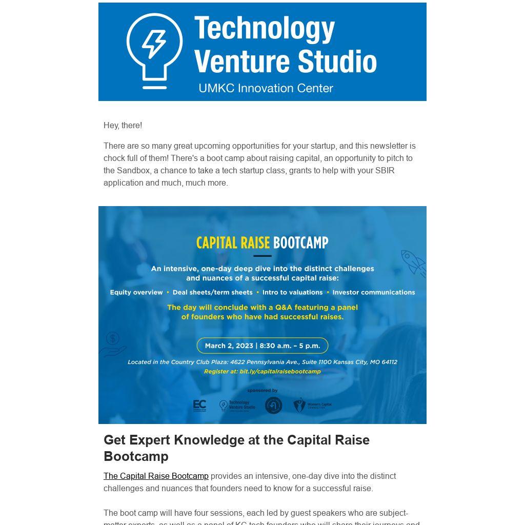 The boot camp will have four sessions, each led by guest speakers who are subject-matter experts, as well as a panel of KC tech founders who will share their journeys and advice from their successful capital raise. Register here.