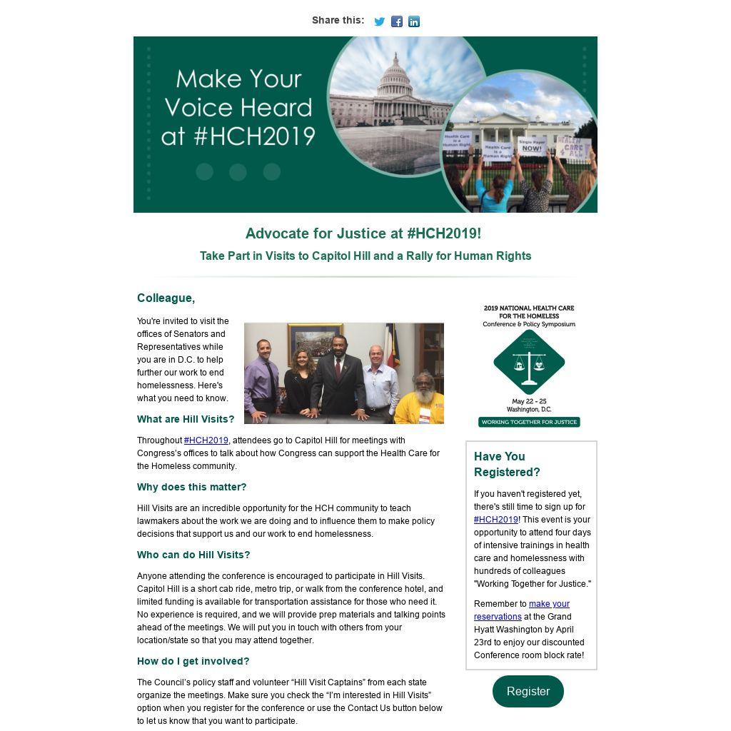 Hill Visits are an incredible opportunity for the HCH community to teach lawmakers about the work we are doing and to influence them to make policy decisions that support us and our work to end homelessness.