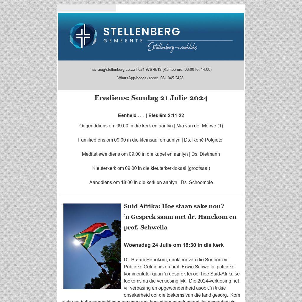 Jy kan gemeentenuus weekliks deur middel van die Stellenberg-weekliks per e-pos ontvang. Stuur jou e-posadres aan sanel@stellenberg.co.za. - Op jou selfoon: