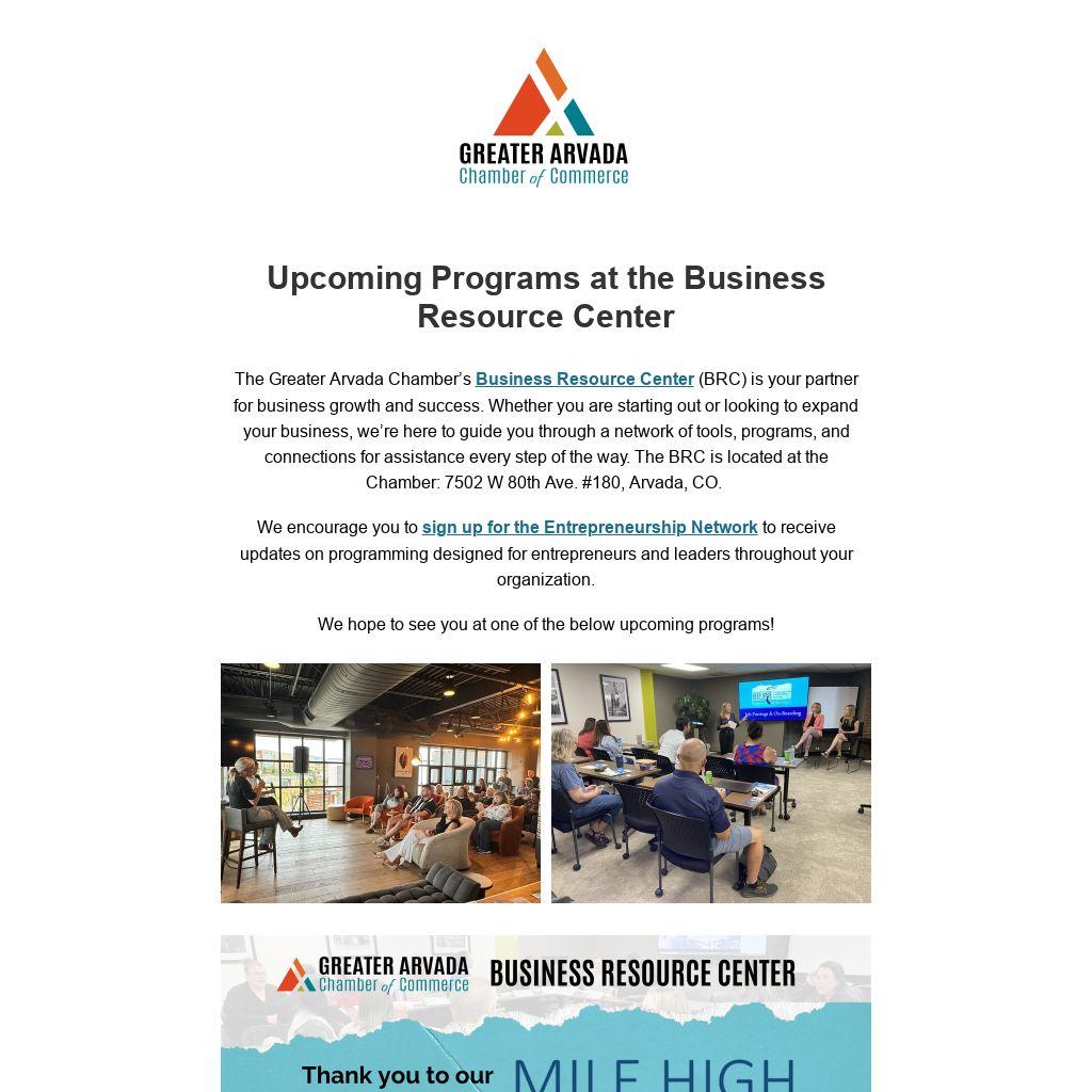The Greater Arvada Chamber’s Business Resource Center (BRC) is your partner for business growth and success. Whether you are starting out or looking to expand your business, we’re here to guide you through a network of tools, programs, and connections for assistance every step of the way. The BRC is located at the Chamber: 7502 W 80th Ave. #180, Arvada, CO.