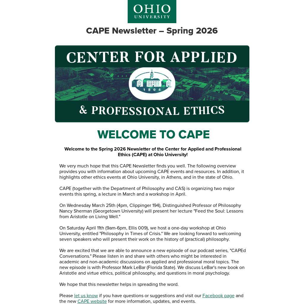 Welcome to the Spring 2026 Newsletter of the Center for Applied and Professional Ethics (CAPE) at Ohio University!