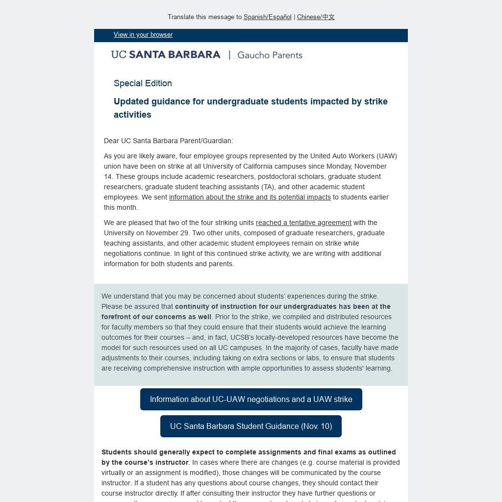 Like you, we are hopeful that an agreement will be reached soon. We are assured that the University will continue to make every effort to negotiate in good faith with UAW representatives, and that the University will continue to communicate to the UAW and its members about the importance of respecting decisions by members of our campus community, including students, about the strike.