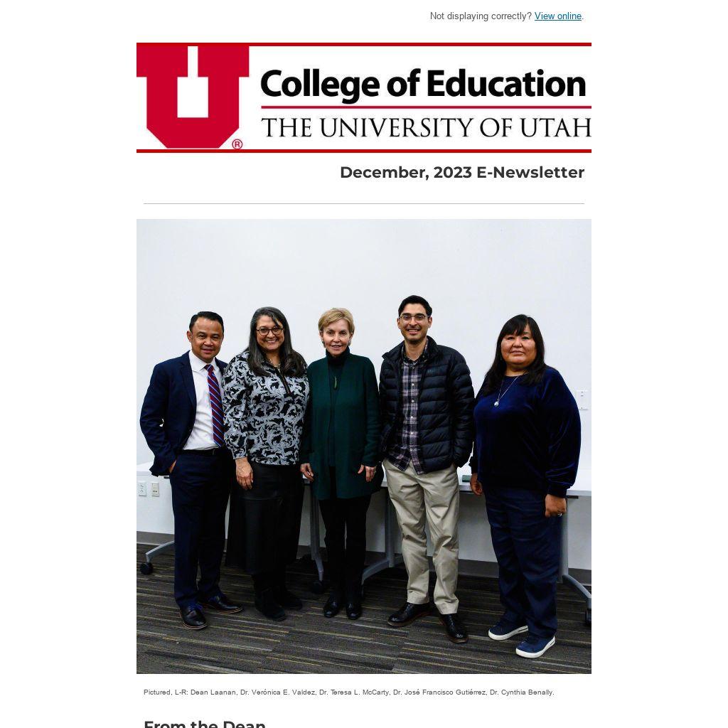 The top of our College of Education e-newsletter is a wonderful space to share your short news: interviews, awards, departmental events, etc. Past features have included Lynne Zummo's interview on KPCW's This Green Earth, a recap of UITE Connect's Fall 2023 meeting, and alum Bruce Eschler's APEX award. Please use the red button to share your news.