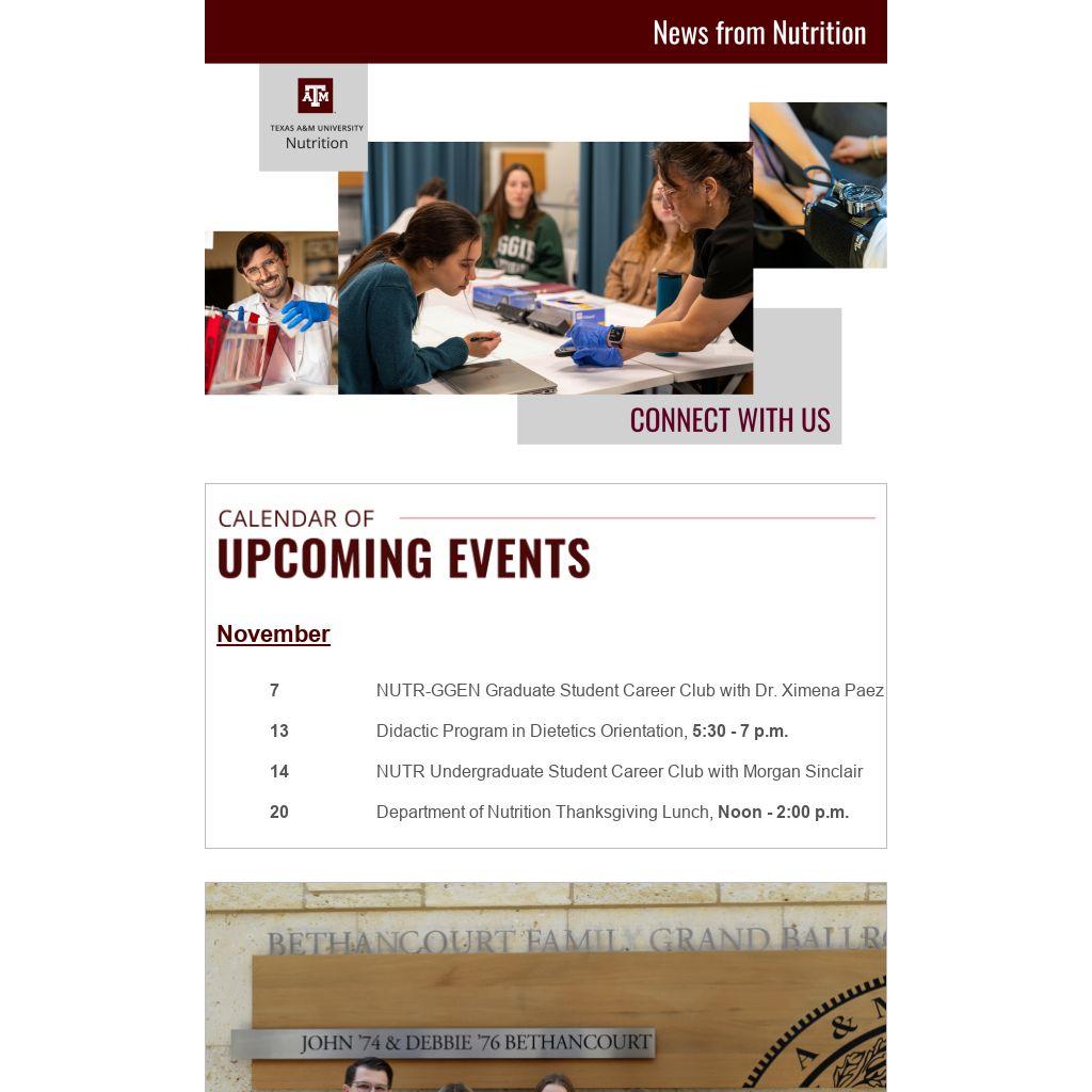 The Department of Nutrition at Texas A&M University is committed to providing students with an exceptional education that equips them with the knowledge, skills and expertise to excel as leaders in nutrition, health and food systems. Our students receive a comprehensive, science-driven education that prepares them for careers in health care, clinical nutrition, research, public health and more.