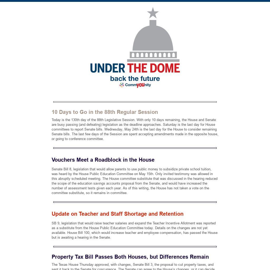 The House also approved a related constitutional amendment, Senate Joint Resolution 3, to let Texans vote in November on whether to compress the school district tax rate by 15 cents. A 10-cent compression has already been approved in the budget.