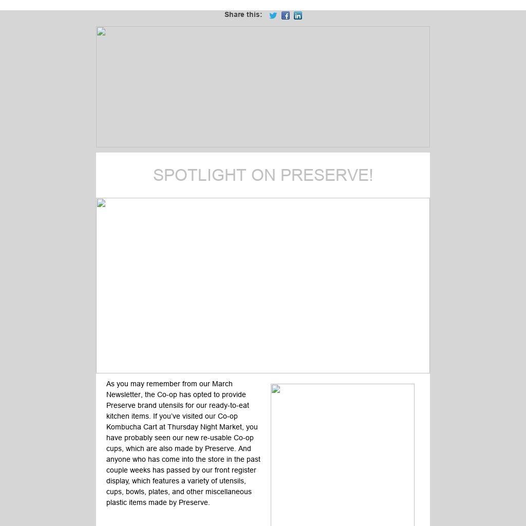 As you may remember from our March Newsletter, the Co-op has opted to provide Preserve brand utensils for our ready-to-eat kitchen items. If you’ve visited our Co-op Kombucha Cart at Thursday Night Market, you have probably seen our new re-usable Co-op cups, which are also made by Preserve. And anyone who has come into the store in the past couple weeks has passed by our front register display, which features a variety of utensils, cups, bowls, plates, and other miscellaneous plastic items made by Preserve.