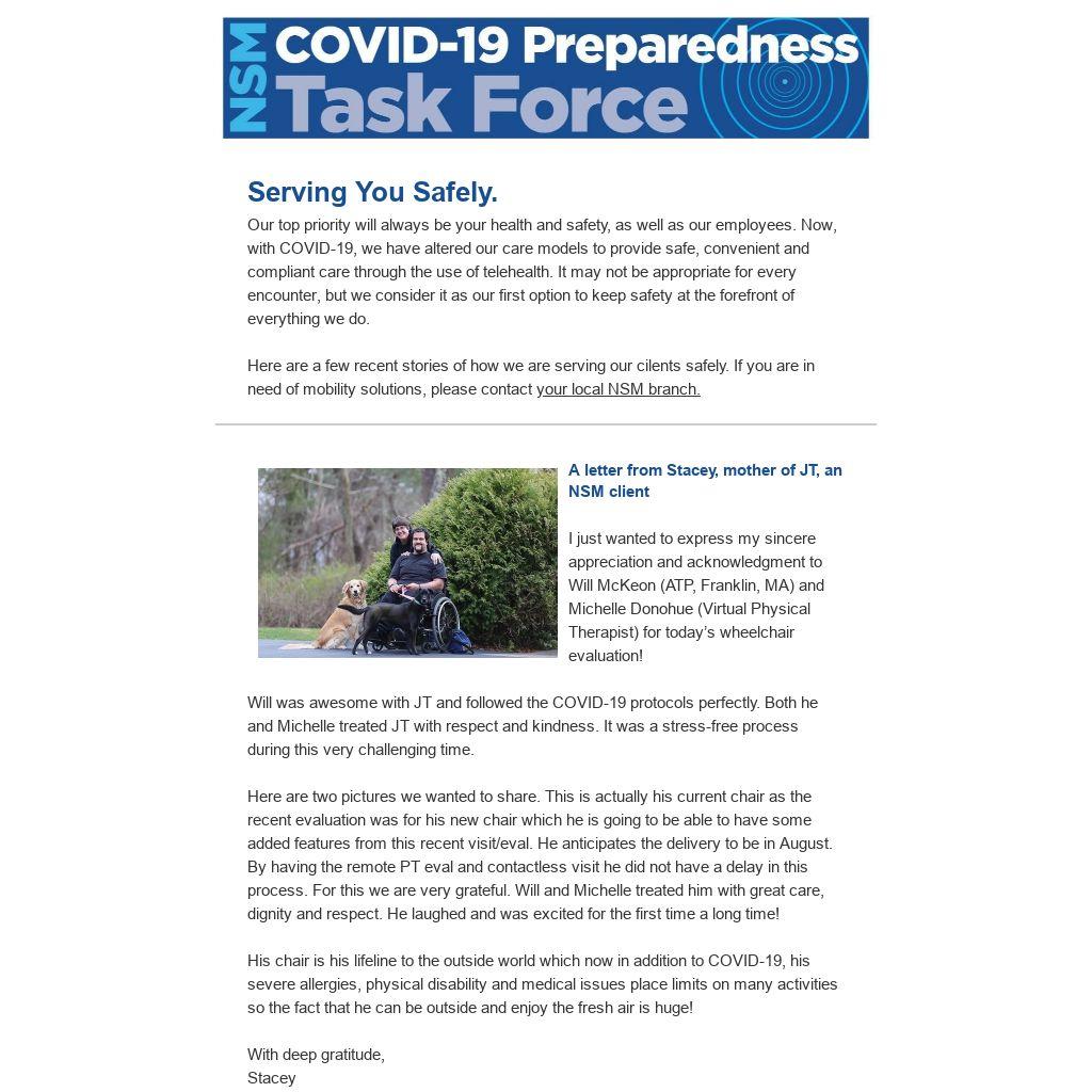 Here are two pictures we wanted to share. This is actually his current chair as the recent evaluation was for his new chair which he is going to be able to have some added features from this recent visit/eval. He anticipates the delivery to be in August. By having the remote PT eval and contactless visit he did not have a delay in this process. For this we are very grateful. Will and Michelle treated him with great care, dignity and respect. He laughed and was excited for the first time a long time!