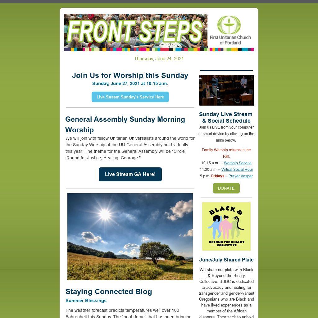 The weather forecast predicts temperatures well over 100 Fahrenheit this Sunday. The āheat domeā that has been bringing record temperatures to much of the desert west is arriving in Portland. I love the warmth and light of summer, but I find myself so thankful for the blessing of NOT preaching from our Sanctuary this Sunday.Ā
