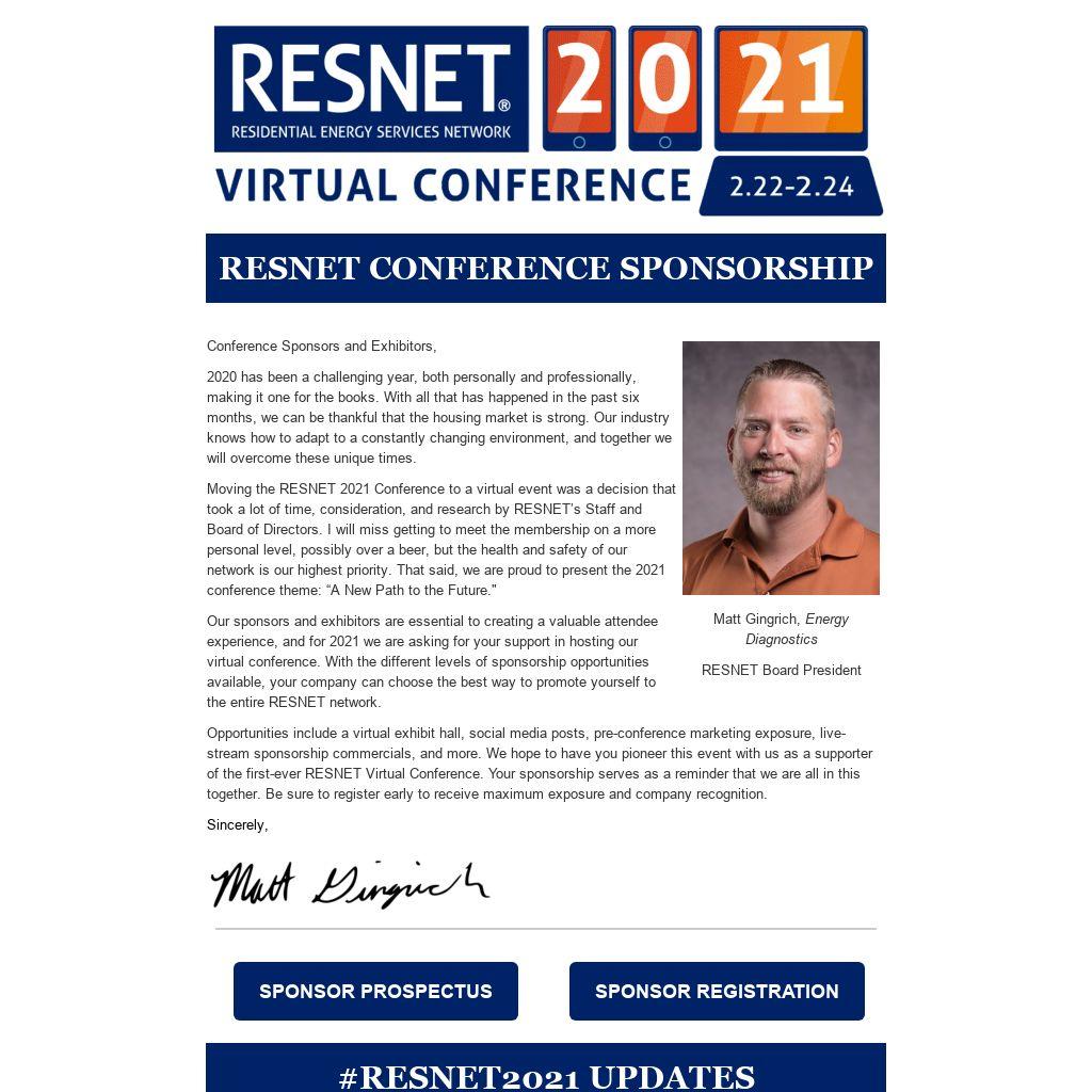 Opportunities include a virtual exhibit hall, social media posts, pre-conference marketing exposure, live-stream sponsorship commercials, and more. We hope to have you pioneer this event with us as a supporter of the first-ever RESNET Virtual Conference. Your sponsorship serves as a reminder that we are all in this together. Be sure to register early to receive maximum exposure and company recognition.