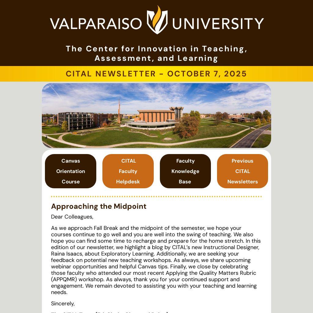 As we approach Fall Break and the midpoint of the semester, we hope your courses continue to go well and you are well into the swing of teaching. We also hope you can find some time to recharge and prepare for the home stretch. In this edition of our newsletter, we highlight a blog by CITAL’s new Instructional Designer, Raina Isaacs, about Exploratory Learning. Additionally, we are seeking your feedback on potential new teaching workshops. As always, we share upcoming webinar opportunities and helpful Canvas tips. Finally, we close by celebrating those faculty who attended our most recent Applying the Quality Matters Rubric (APPQMR) workshop. As always, thank you for your continued support and engagement. We remain devoted to assisting you with your teaching and learning needs.