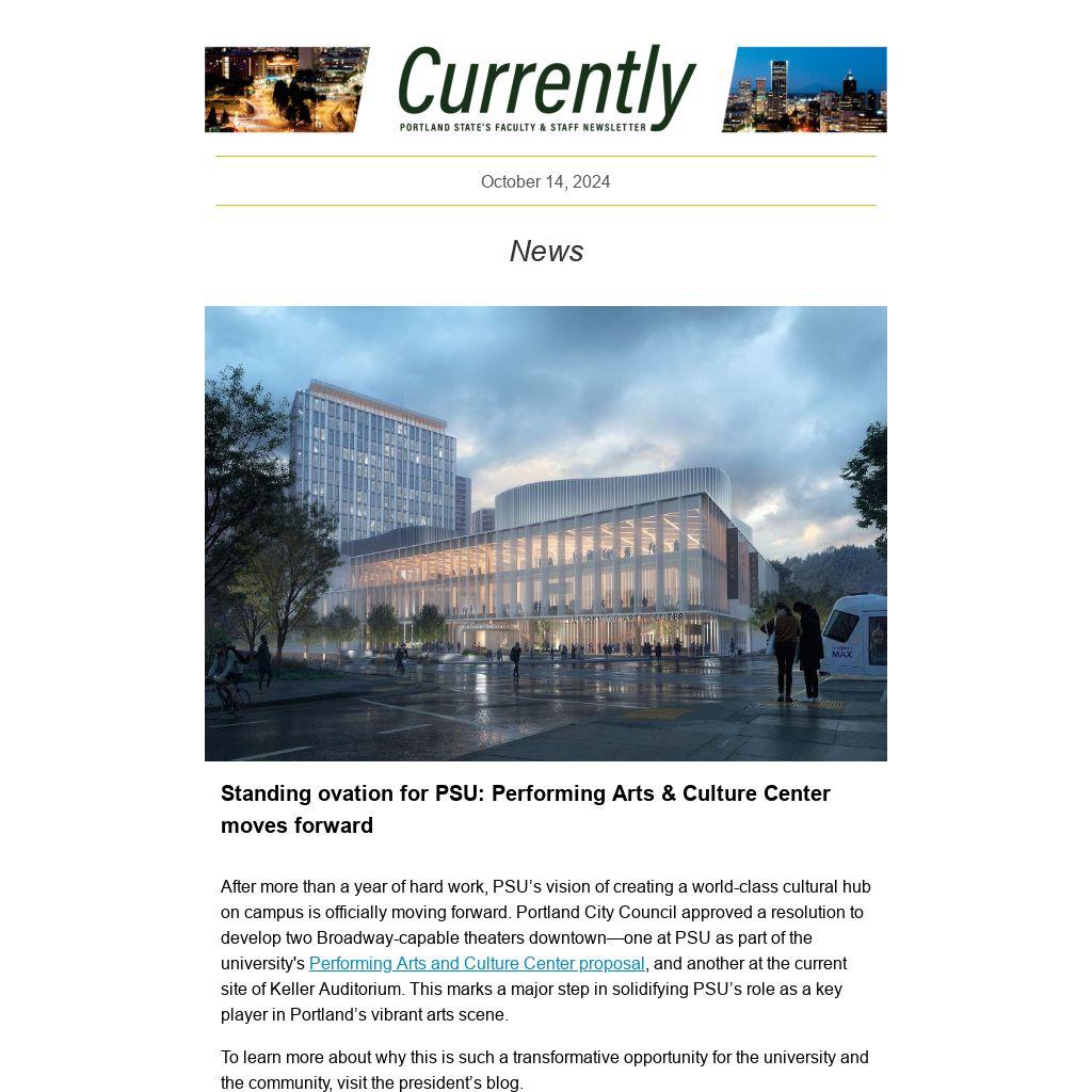 CURRENTLY is a weekly newsletter for the employees of Portland State University, published by University Communications. News items, events and accolades should be sent to currently@pdx.edu. Deadline is noon, the Tuesday before publication. See the Currently website for submission guidelines and schedule.