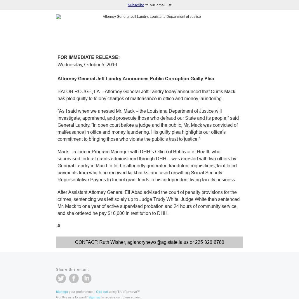BATON ROUGE, LA – Attorney General Jeff Landry today announced that Curtis Mack has pled guilty to felony charges of malfeasance in office and money laundering.