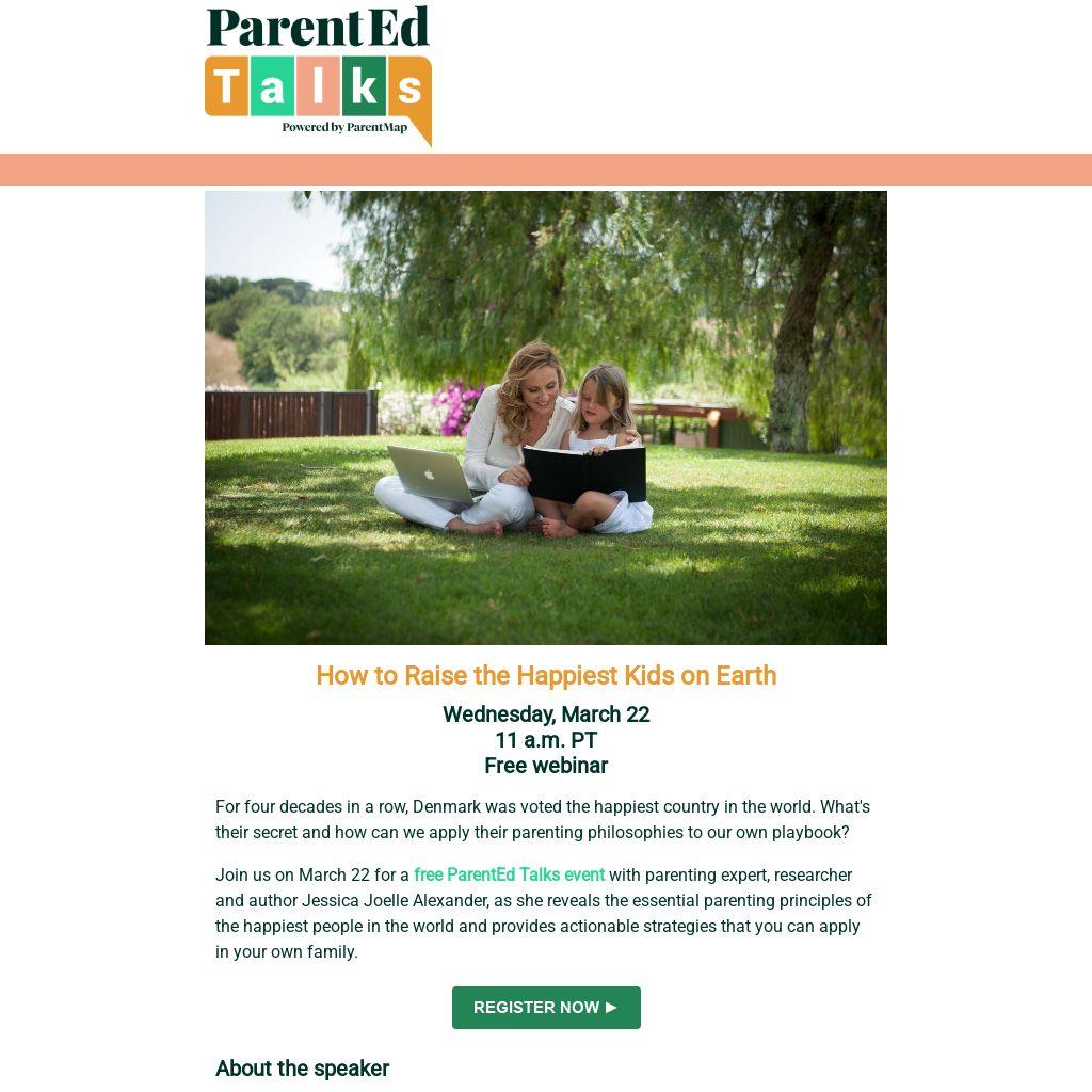 Join us on March 22 for a free ParentEd Talks event with parenting expert, researcher and author Jessica Joelle Alexander, as she reveals the essential parenting principles of the happiest people in the world and provides actionable strategies that you can apply in your own family.