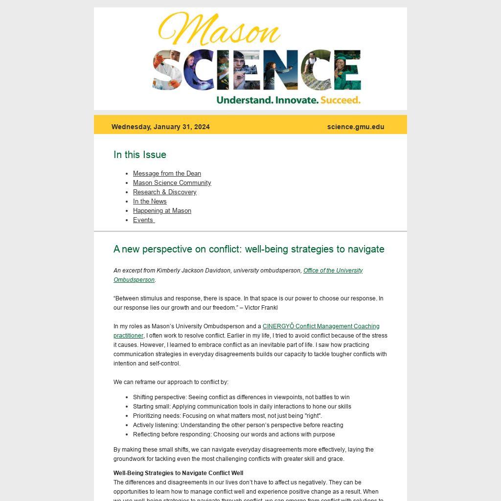 Mason Science Faculty Lunch February 1, 2024 | Noon to 1 p.m. | Exploratory Hall 3302 Bring your lunch and enjoy an hour away from your computer with fellow Mason Science faculty.