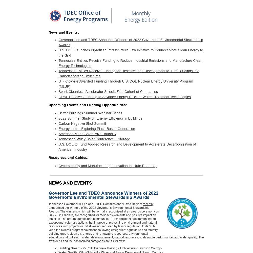 | Governor Lee and TDEC Announce Winners of 2022 Governor’s Environmental Stewardship Awards