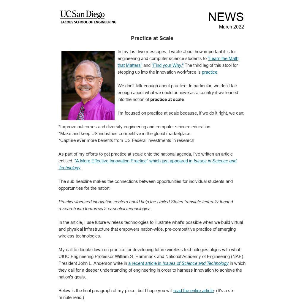 My call to double down on practice for developing future wireless technologies aligns with what UIUC Engineering Professor William S. Hammack and National Academy of Engineering (NAE) President John L. Anderson write in a recent article in Issues of Science and Technology in which they call for a deeper understanding of engineering in order to harness innovation to achieve the nation's goals.