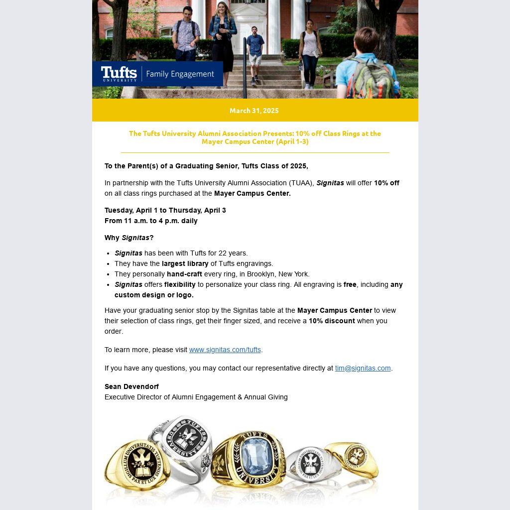 In partnership with the Tufts University Alumni Association (TUAA), Signitas will offer 10% off on all class rings purchased at the Mayer Campus Center.