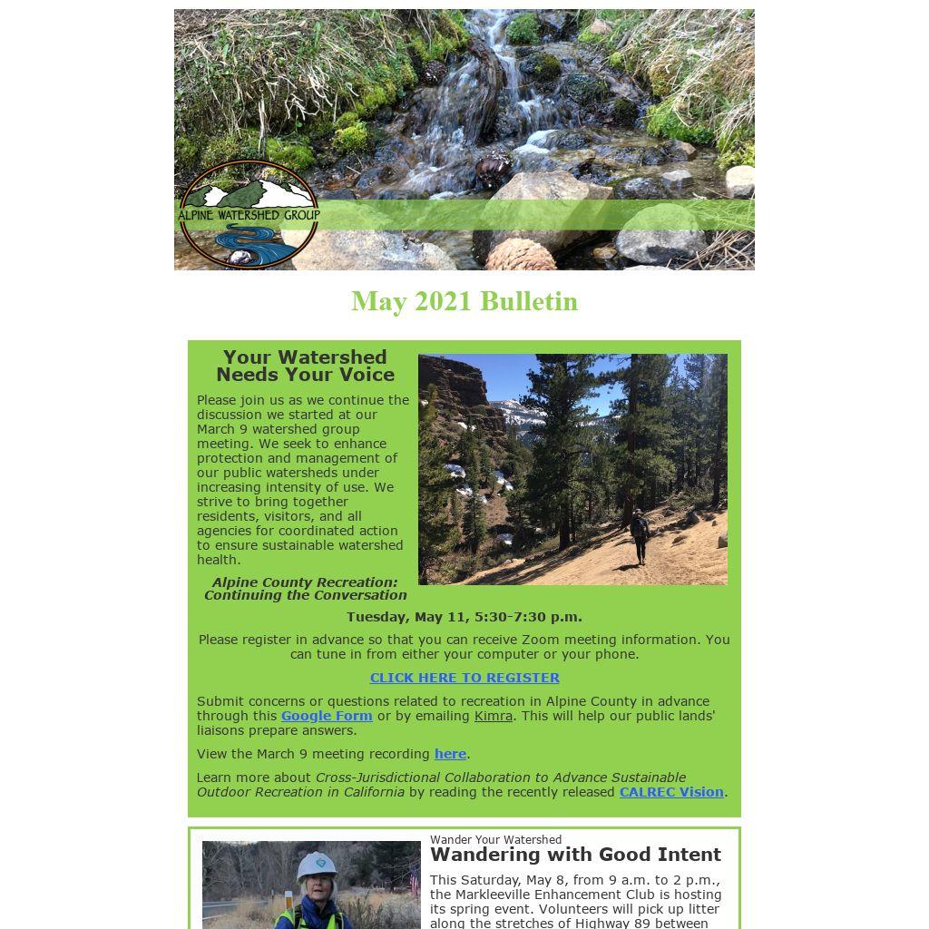 Please join us as we continue the discussion we started at our March 9 watershed group meeting. We seek to enhance protection and management of our public watersheds under increasing intensity of use. We strive to bring together residents, visitors, and all agencies for coordinated action to ensure sustainable watershed health.