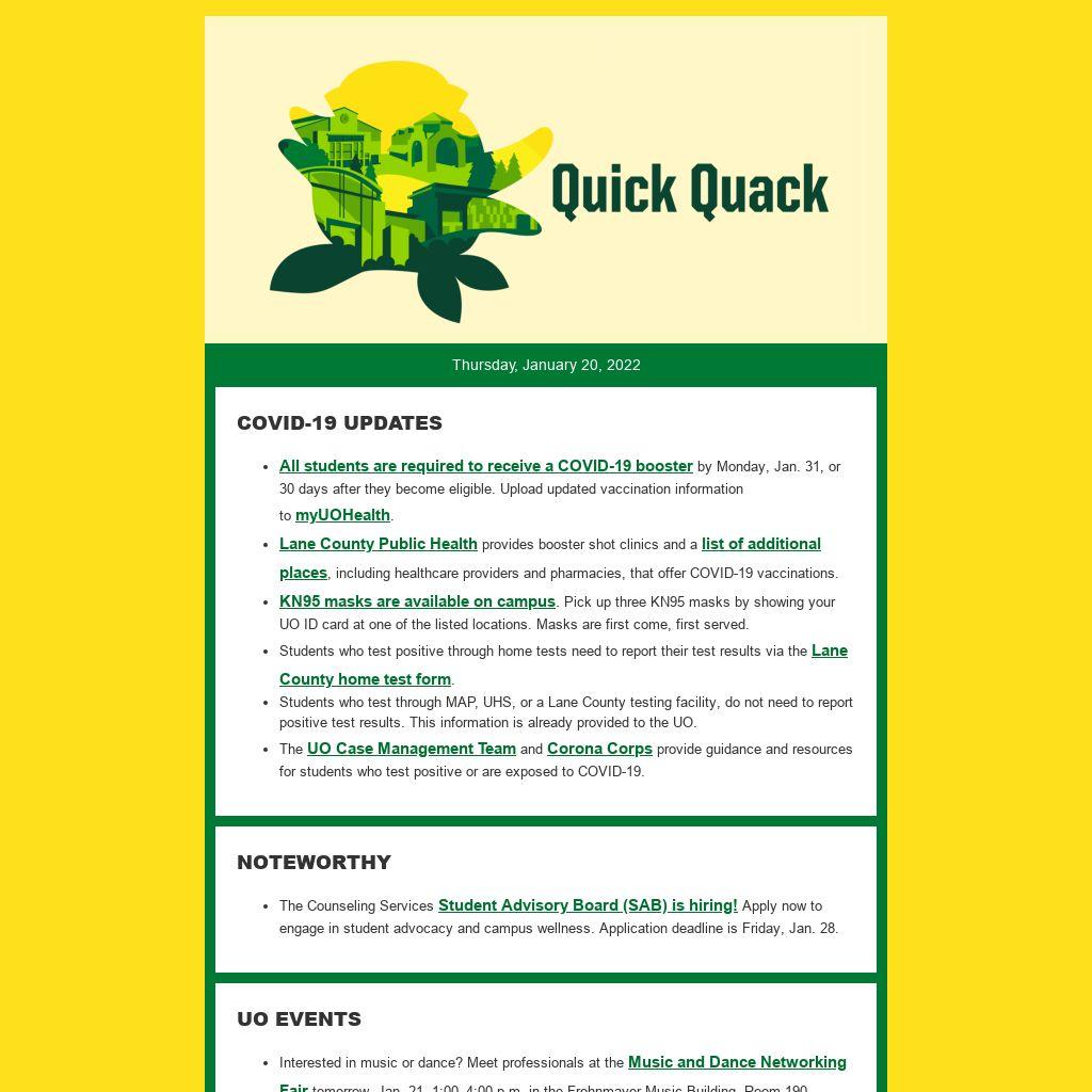 KN95 masks are available on campus. Pick up three KN95 masks by showing your UO ID card at one of the listed locations. Masks are first come, first served.