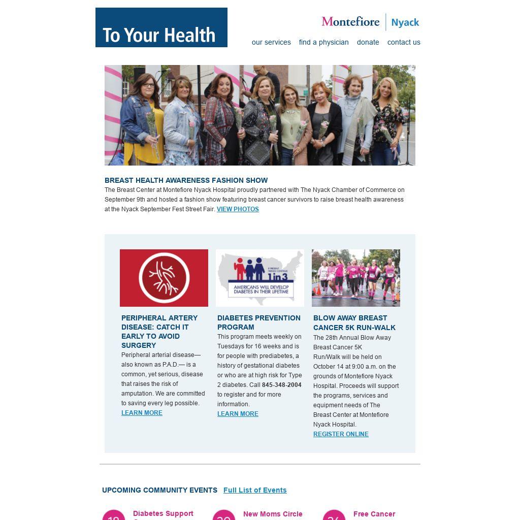 The Breast Center at Montefiore Nyack Hospital will offer free breast exams, mammography, and if needed, pelvic exams with PAP tests for women ages 40 and over with no insurance or who are underinsured. Registration is requested, walk-ins welcome. To register, please call 845-348-8551. Spanish-speaking assistance available at 845-348-8582.