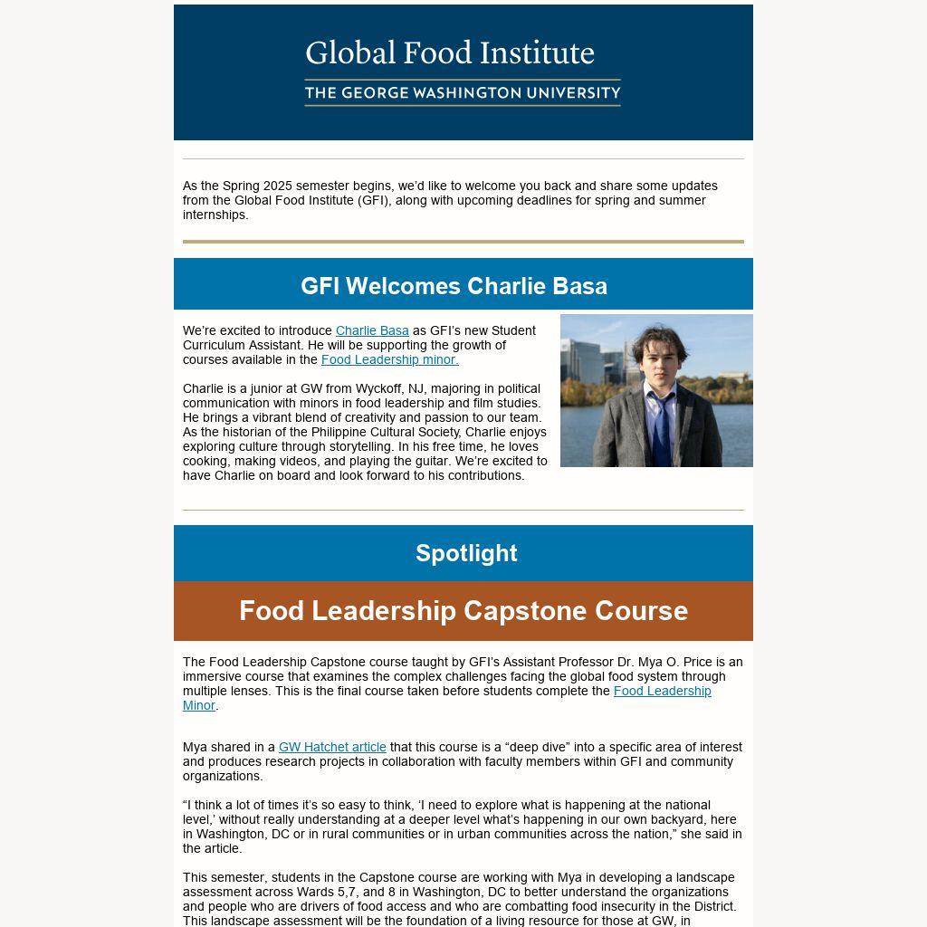 As the Spring 2025 semester begins, we’d like to welcome you back and share some updates from the Global Food Institute (GFI), along with upcoming deadlines for spring and summer internships.