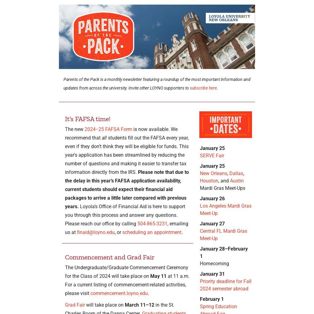Parents of the Pack is a monthly newsletter featuring a roundup of the most important information and updates from across the university. Invite other LOYNO supporters to subscribe here.
