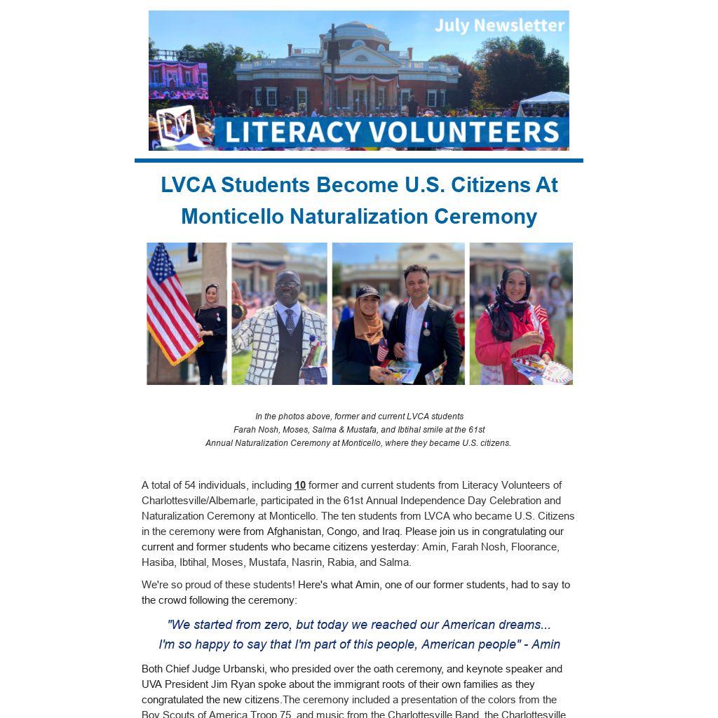 A total of 54 individuals, including 10 former and current students from Literacy Volunteers of Charlottesville/Albemarle, participated in the 61st Annual Independence Day Celebration and Naturalization Ceremony at Monticello. The ten students from LVCA who became U.S. Citizens in the ceremony were from Afghanistan, Congo, and Iraq. Please join us in congratulating our current and former students who became citizens yesterday: Amin, Farah Nosh, Floorance, Hasiba, Ibtihal, Moses, Mustafa, Nasrin, Rabia, and Salma.