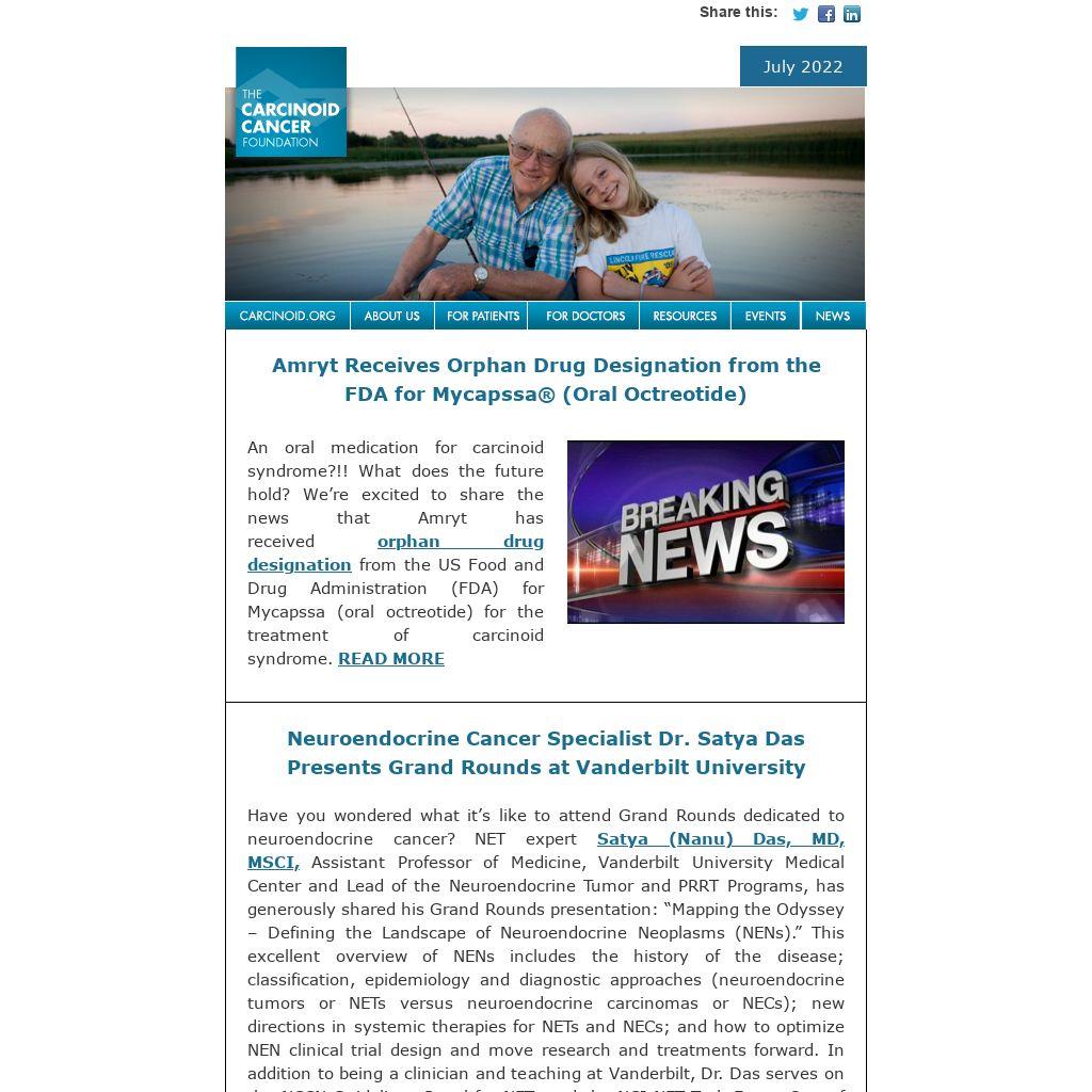 An oral medication for carcinoid syndrome?!! What does the future hold? We’re excited to share the news that Amryt has received orphan drug designationfrom the US Food and Drug Administration (FDA) for Mycapssa (oral octreotide) for the treatment of carcinoid syndrome. READ MORE