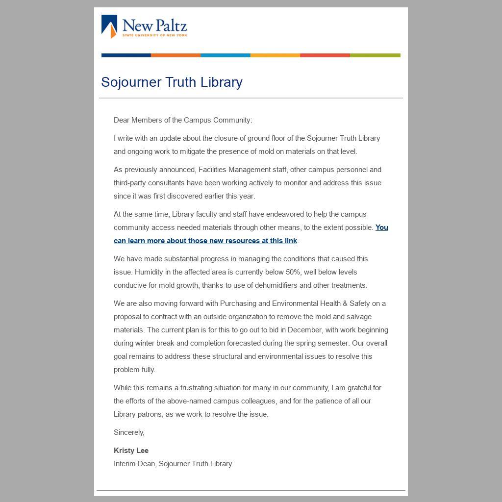 I write with an update about the closure of ground floor of the Sojourner Truth Library and ongoing work to mitigate the presence of mold on materials on that level.