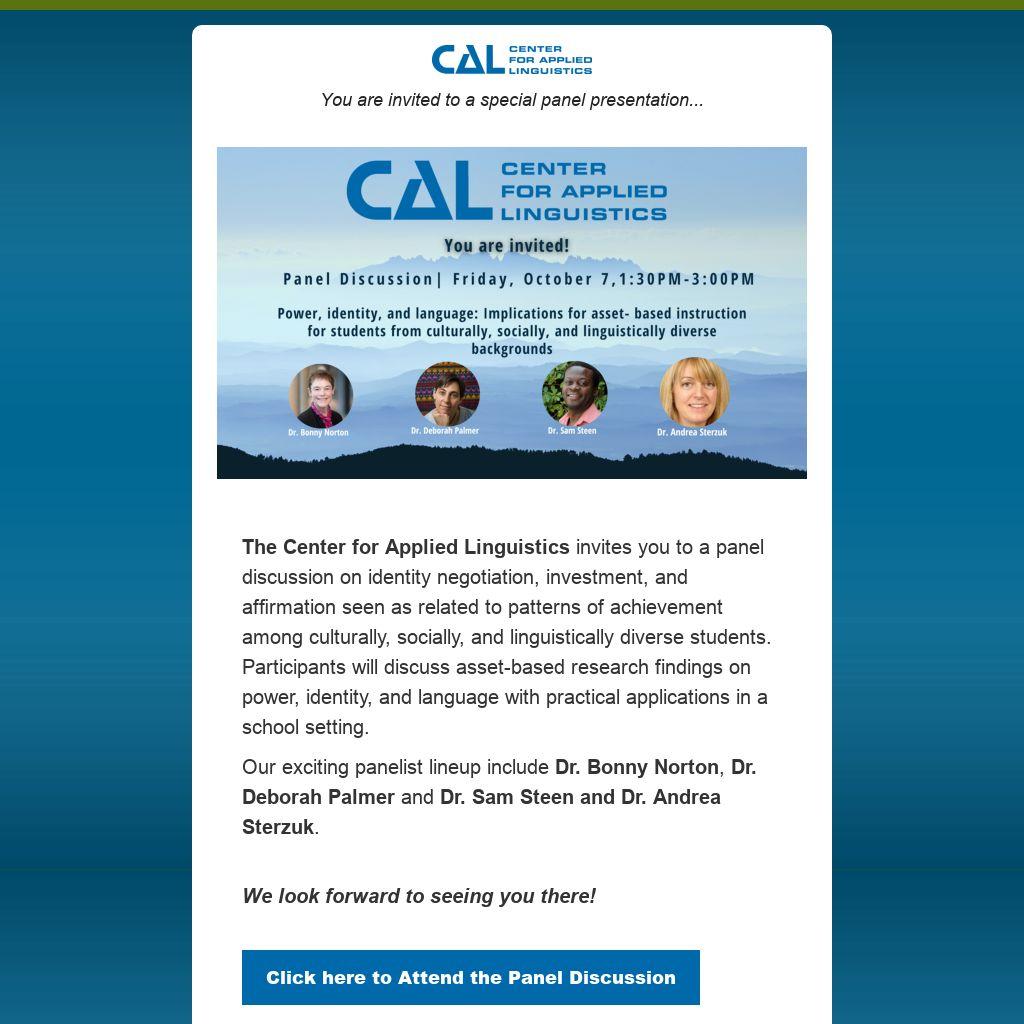 The Center for Applied Linguistics invites you to a panel discussion on identity negotiation, investment, and affirmation seen as related to patterns of achievement among culturally, socially, and linguistically diverse students. Participants will discuss asset-based research findings on power, identity, and language with practical applications in a school setting.