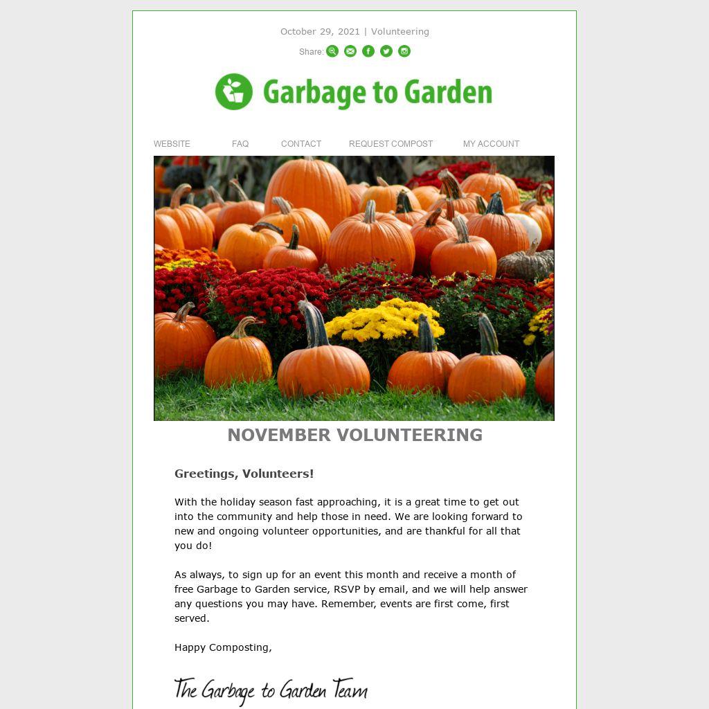 As always, to sign up for an event this month and receive a month of free Garbage to Garden service, RSVP by email, and we will help answer any questions you may have. Remember, events are first come, first served.