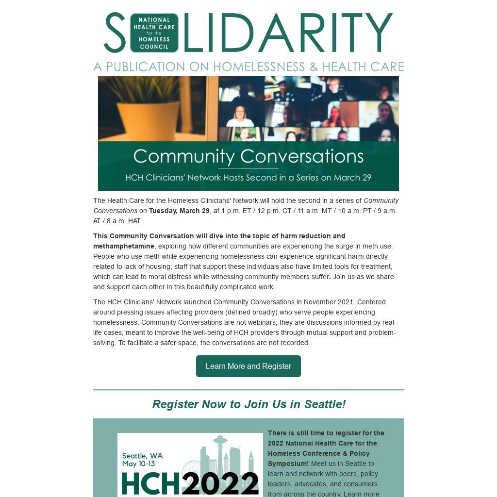 The Health Care for the Homeless Clinicians' Network will hold the second in a series of Community Conversations on Tuesday, March 29, at 1 p.m. ET / 12 p.m. CT / 11 a.m. MT / 10 a.m. PT / 9 a.m. AT / 8 a.m. HAT.