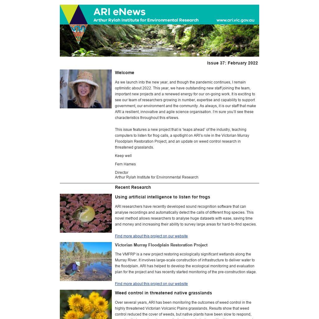 If you know someone who may like to receive the ARI eNews, forward this email on using the 'Share this' option at the top. If this has been forwarded on to you there is an option to sign-up below, or use the ‘Subscribe’ button on our website, or email research.ari@delwp.vic.gov.au to be added to the ARI eNews mailing list.