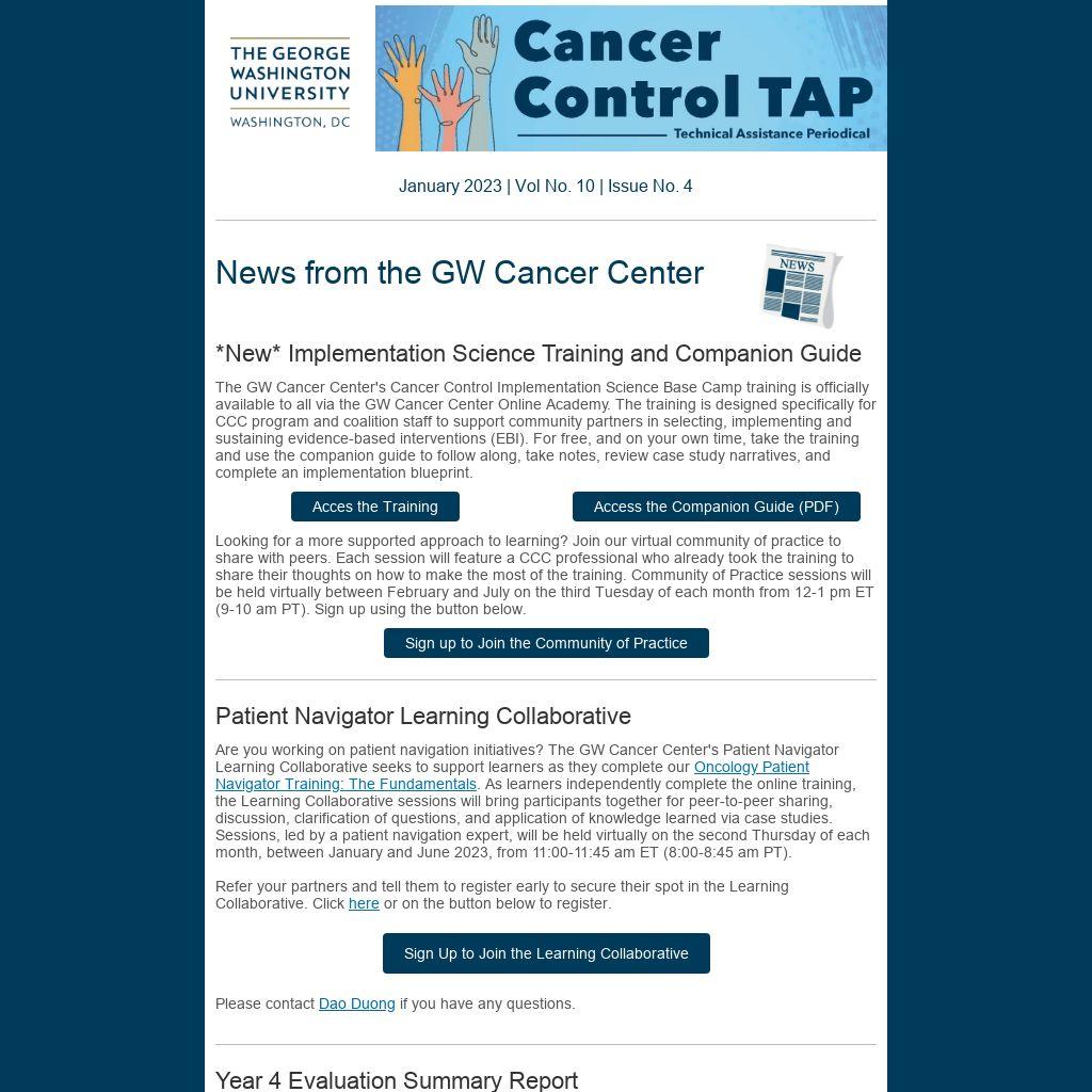 Each year, the GW Cancer Center prepares an overview of technical assistance and training activities provided through its comprehensive cancer control technical assistance project, "Building Cancer Control Capacity: Scaling Evidence to Practice to Advance Health Equity." The purpose of the summary is to give an outline of activities and progress in Year 04 (October 2021 to September 2022); provide transparency and accountability; and create an opportunity for dialogue and input to improve future project activities. Read the report on the Cancer Control TAP website.