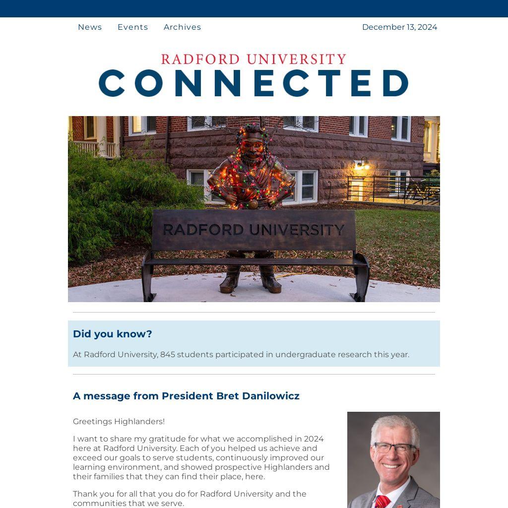 I want to share my gratitude for what we accomplished in 2024 here at Radford University. Each of you helped us achieve and exceed our goals to serve students, continuously improved our learning environment, and showed prospective Highlanders and their families that they can find their place, here.
