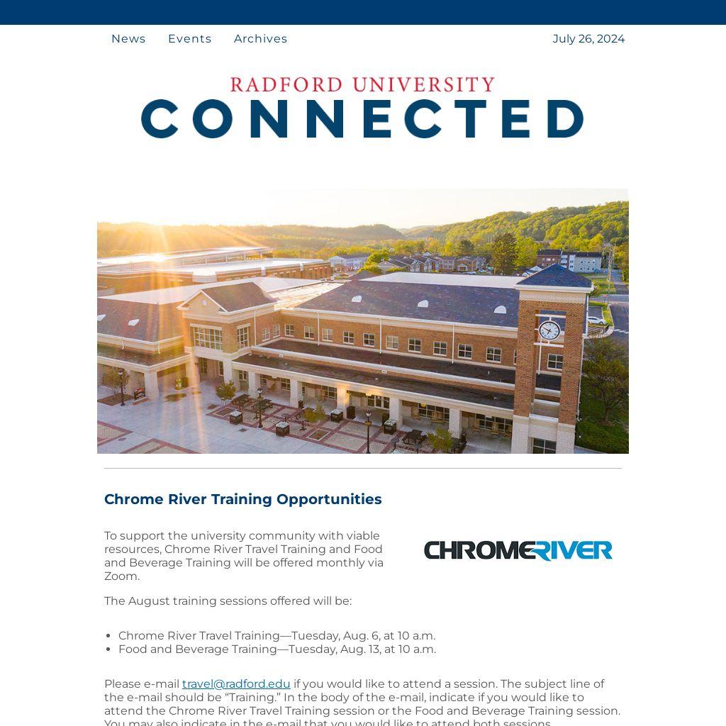 - Chrome River Travel Training—Tuesday, Aug. 6, at 10 a.m.