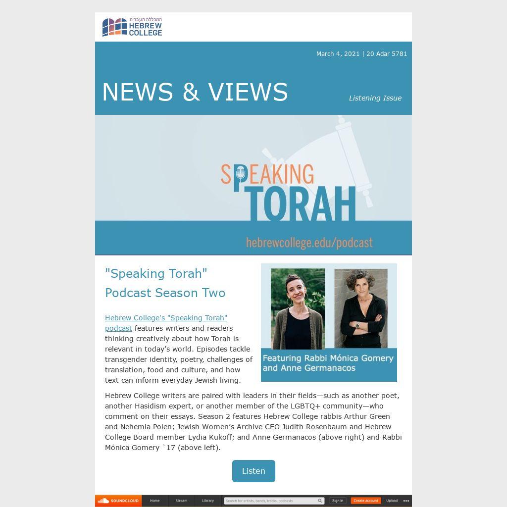 Hebrew College's "Speaking Torah" podcast features writers and readers thinking creatively about how Torah is relevant in today’s world. Episodes tackle transgender identity, poetry, challenges of translation, food and culture, and how text can inform everyday Jewish living.