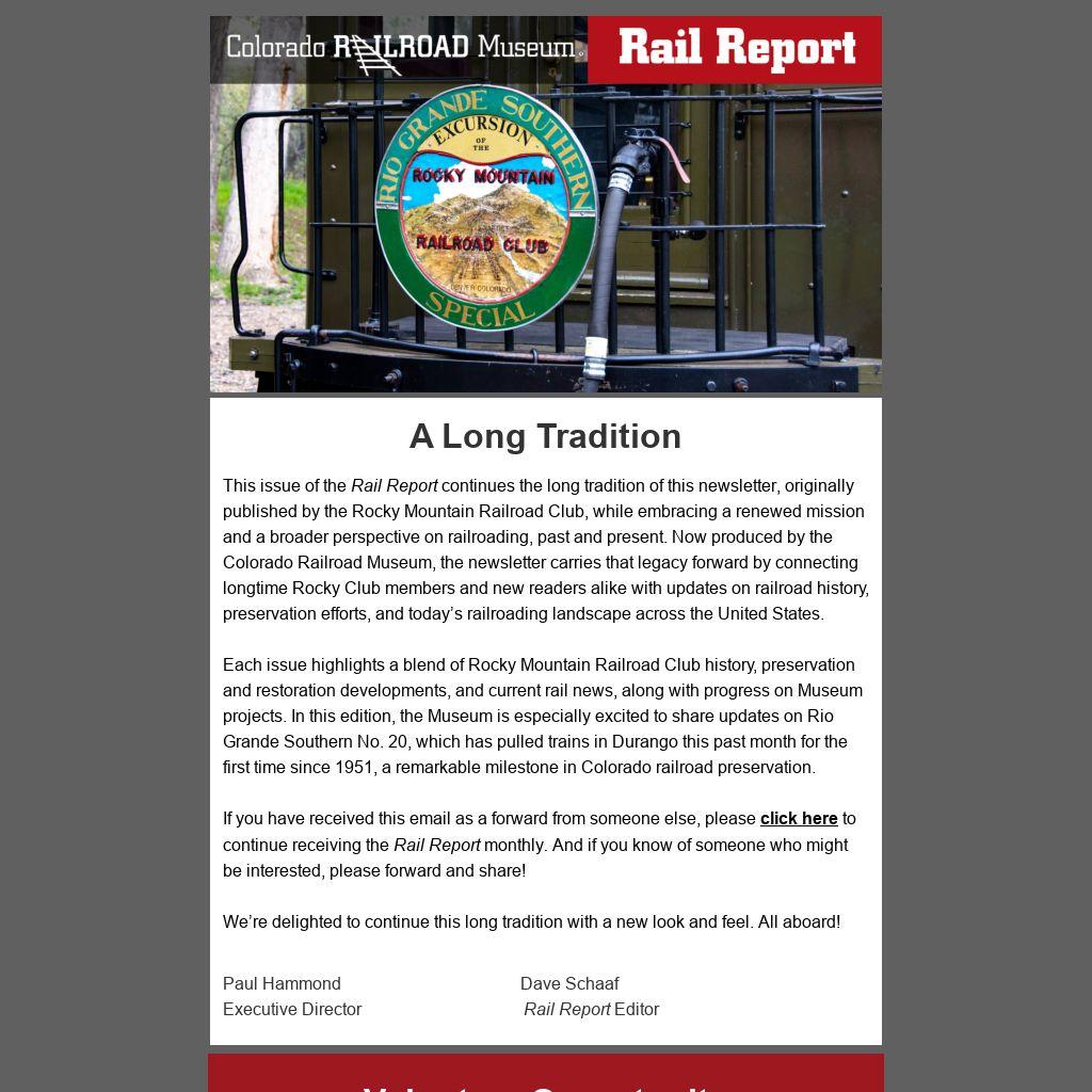 If you have received this email as a forward from someone else, please click here to continue receiving the Rail Report monthly. And if you know of someone who might be interested, please forward and share!