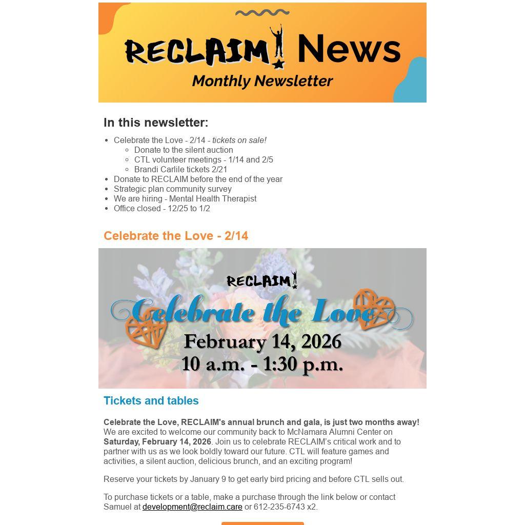 Celebrate the Love, RECLAIM's annual brunch and gala, is just two months away! We are excited to welcome our community back to McNamara Alumni Center on Saturday, February 14, 2026. Join us to celebrate RECLAIM’s critical work and to partner with us as we look boldly toward our future. CTL will feature games and activities, a silent auction, delicious brunch, and an exciting program!